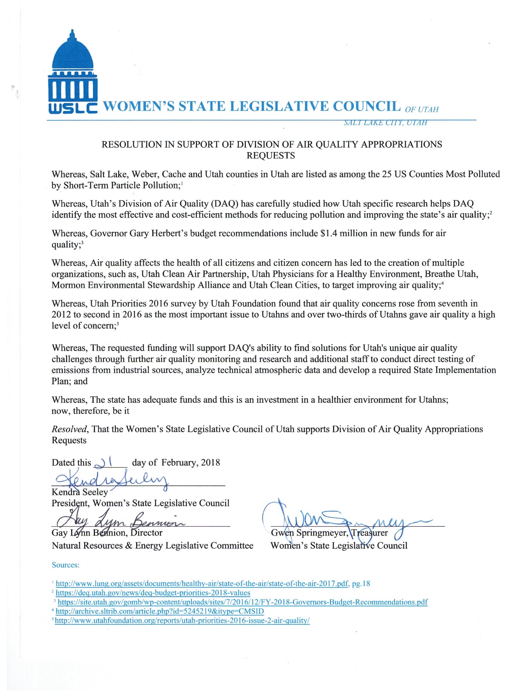 Good evening members, Thanks to the Education Committee for the informative meeting they prepared last Wednesday. The minutes from that meeting are attached along with the Resolution in Support of Division of Air Quality Appropriations Requests that was passed by more than a two-thirds majority of members present and the agenda for the upcoming general meeting. We hope you will be able to join us. Best, Gay Lynn Bennion WSLC Past Corresponding Secretary